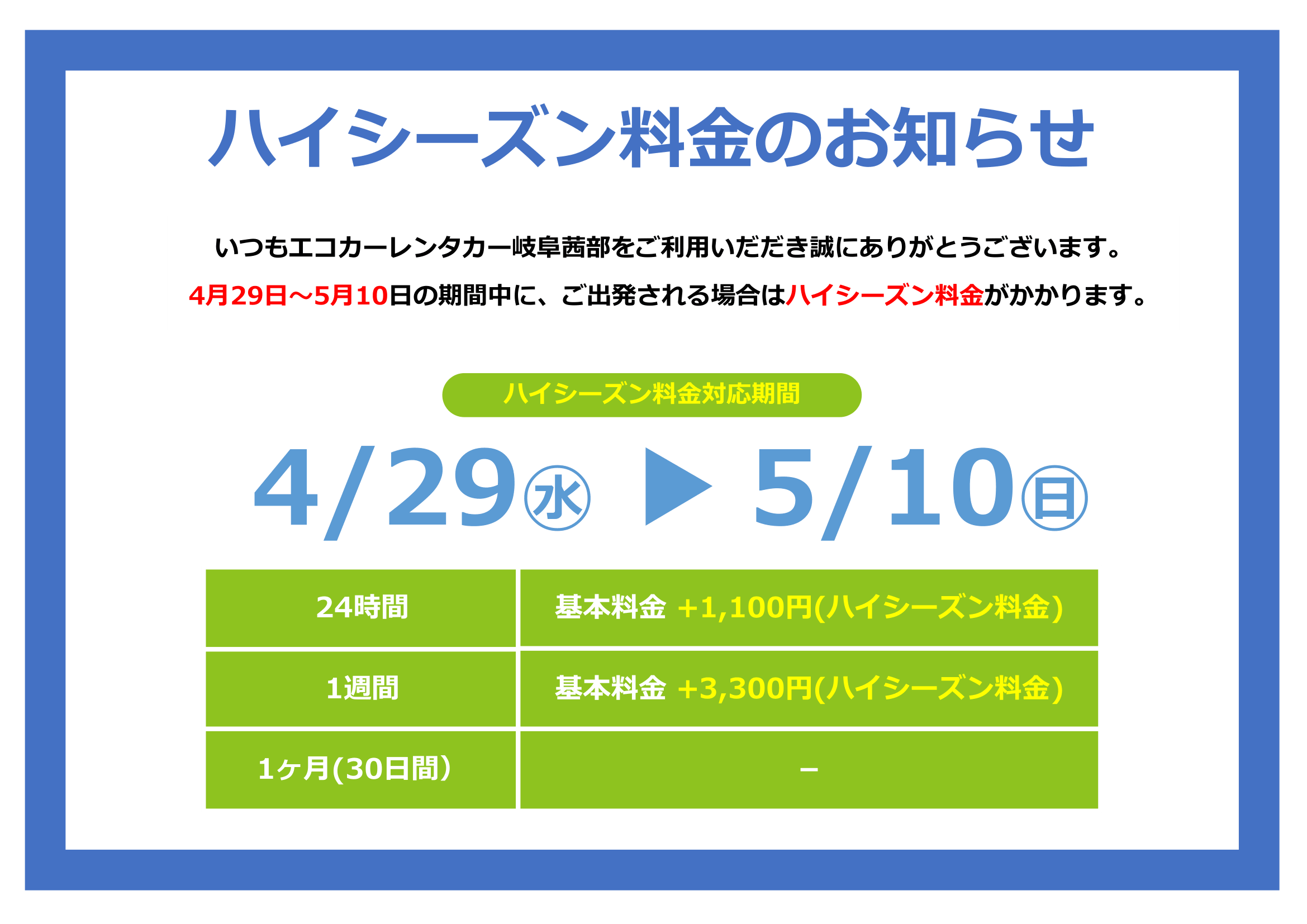 | ゴールデンウィーク 2026年(4/29~5/10) | 1,100円 | 3,300円 | 0円 |